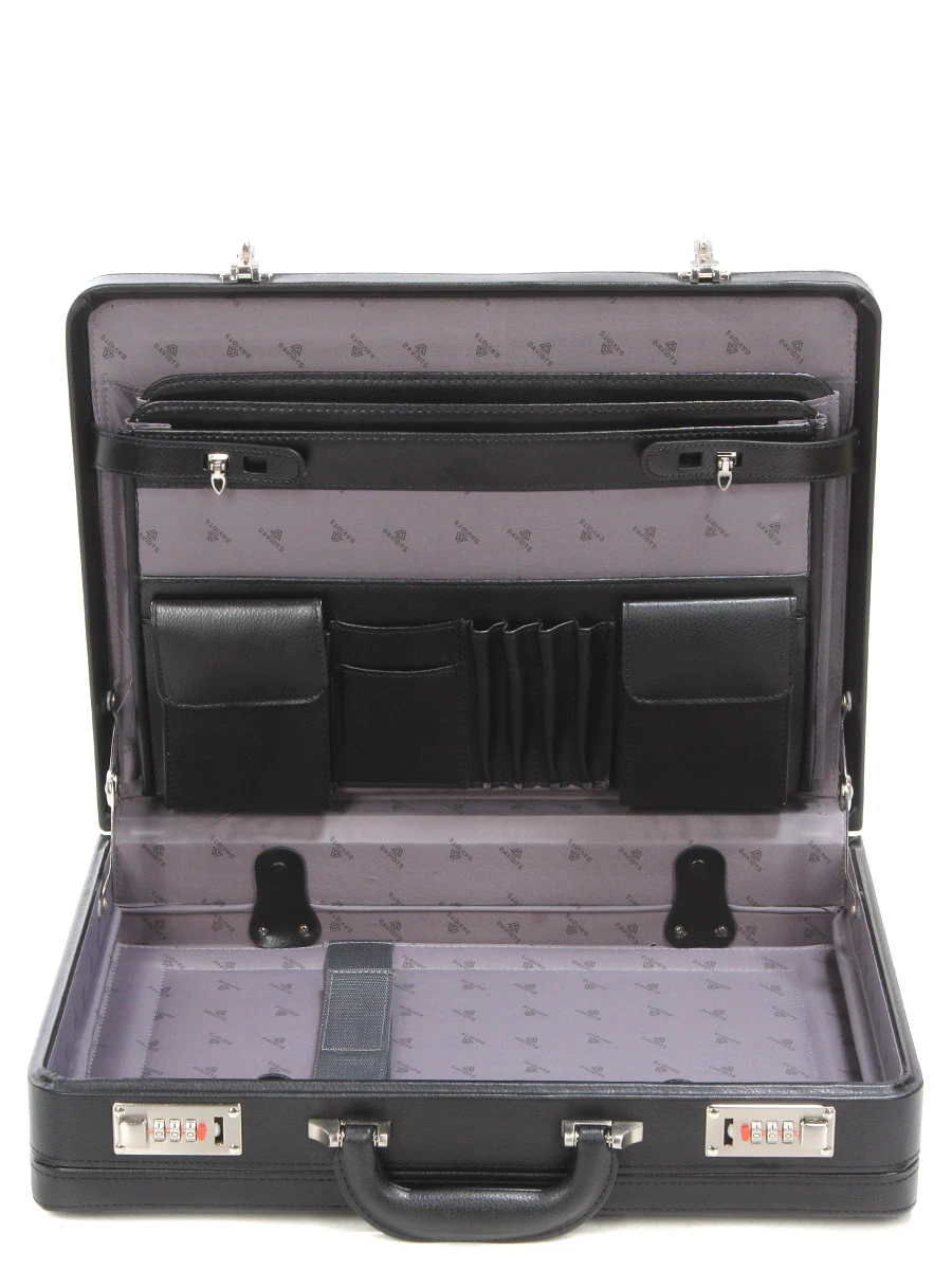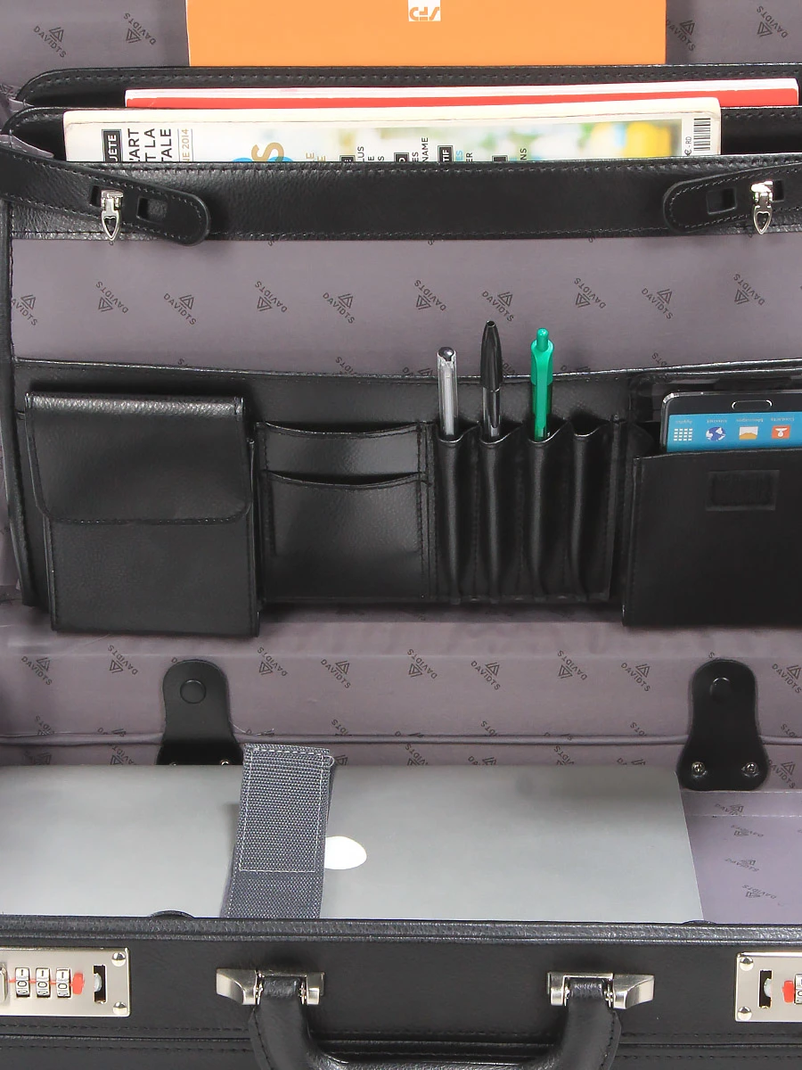 VĂ©ritable compagnon de travail, la serviette Davidts Yale prĂ©voit un emplacement pour chaque Ă©lĂ©ment. Au fond est amĂ©nagĂ© un espace pour un ordinateur jusqu’Ă 17 pouces, protĂ©gĂ© pendant les dĂ©placements par le renfort moussĂ© de la paroi rigide et par deux sangles Ă scratch. Dans la partie supĂ©rieure de l’attachĂ©-case est amĂ©nagĂ© un porte-documents Ă trois soufflets pour classer ses dossiers. Deux pattes rĂ©glables permettent d’ajuster l’Ă©paisseur du porte-documents Ă son contenu. Le panneau organisateur comporte Ă©galement deux poches en cuir se fermant par un rabat Ă scratch pour ranger des tĂ©lĂ©phones portables. Trois passants pour stylos cĂ´toient un porte-cartes. Enfin, une large poche plate ouverte permet de glisser par exemple un calepin ou un petit agenda.