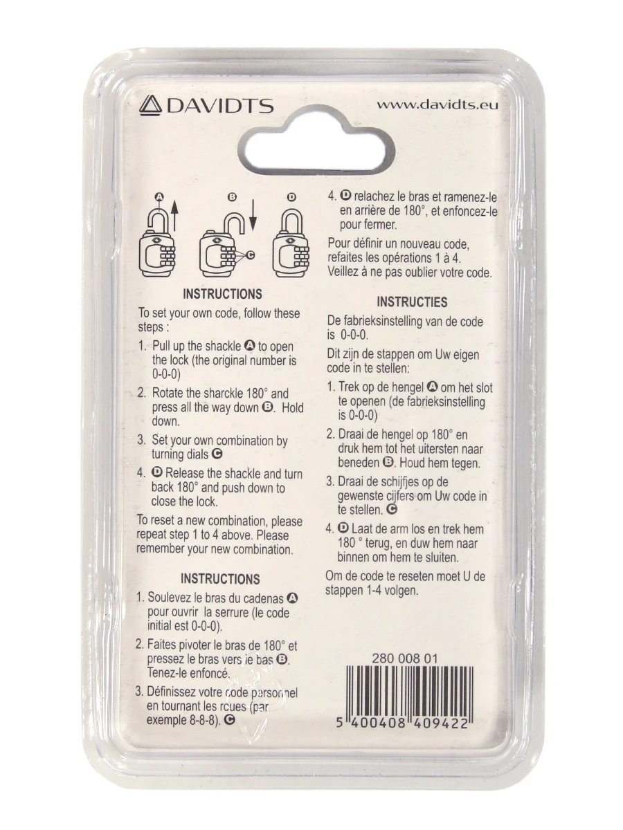 Le cadenas à code TSA Davidts est le parfait accessoire pour les voyageurs qui aiment se déplacer avec sécurité et sûreté. Servant à verrouiller la fermeture de votre bagage à roulettes (valise, sac à dos ou sac de voyage), il évite les vols et/ou les infractions. Ce cadenas est par ailleurs idéal pour partir aux État-Unis.