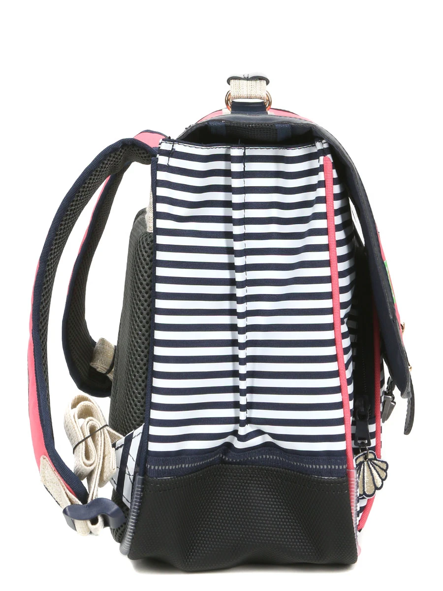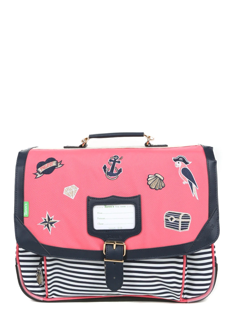 Le cartable Tann’s Enora 38 cm offre des avantages considérables pour les élèves du CP au CE2. Outre son format compatible A4 et 24 x 32, il présente une excellente ergonomie de portage et arbore des détails réfléchissants pour assurer la sécurité de la petite reine des mers. Conçu en polyester recyclé, il est en prime écoresponsable pour préserver la faune et la flore marines. Imprimé marinière, coloris rose pimpant, finitions dorées et jolis patchs brodés inspirés par les aventures épiques de flibustières en herbe sont autant de détails pouvant plaire à votre petite princesse.