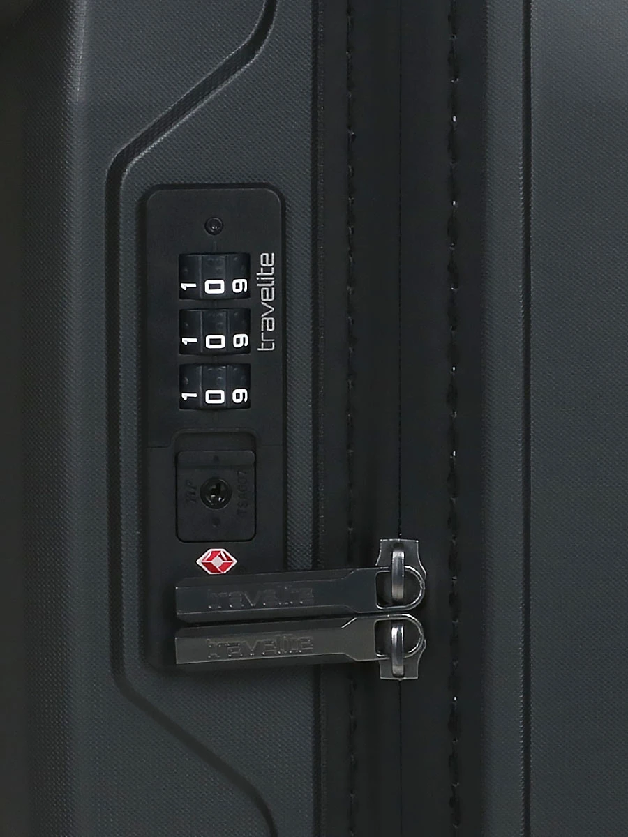 Les valises Travelite Elvaa offrent une glisse fluide et sans accroc avec leurs 4 doubles roulettes multidirectionnelles et leur poignĂ©e tĂ©lescopique double canne (Ă position rĂ©glable pour taille cabine). CĂ´tĂ© sĂ©curitĂ©, rien n’est oubliĂ© avec leur solide fermeture Ă zip inversĂ© et leur serrure TSA Ă code encastrĂ©e sur le cĂ´tĂ© de leur coque.Â