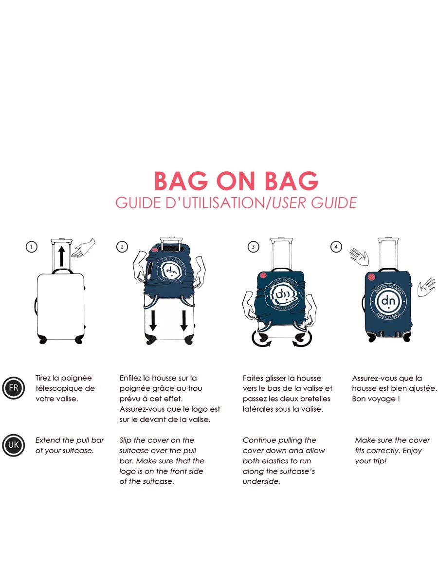 La housse de valise Dandy Nomad Massaï se glisse sur le bagage sans effort, en 30 secondes uniquement. Elle est fournie avec un sac imperméable permettant de la ranger à l’abri de la poussière et des regards indiscrêts lorsqu’on ne l’utilise pas. Elle est par ailleurs équipées d’ouvertures sur les poignées et le trolley afin de déplacer le bagage avec efficacité. Pour toujours plus d’atouts, cette protection est lavable en machine à 30°, très pratique pour éviter de passer trop de temps à la nettoyer manuellement.