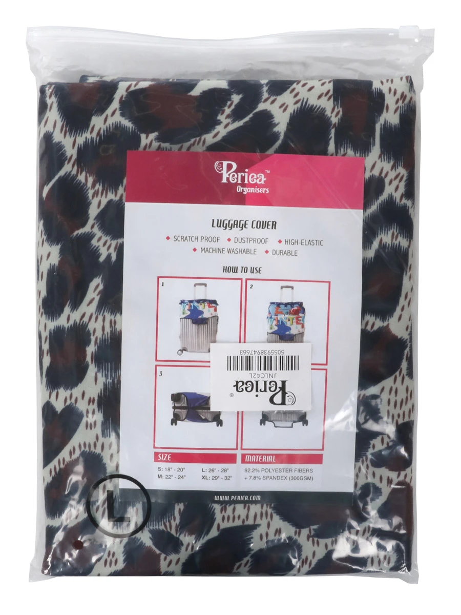 La housse de valise Periea Gold Leopard L, proposĂ©e Ă un très bon rapport qualitĂ©-prix, est l’accessoire indispensable pour prolonger la durabilitĂ© de votre valise prĂ©fĂ©rĂ©e. Son tissu rĂ©sistant aux frottements et aux salissures la protège des dommages mineurs qui surviennent souvent lors de la mise en soute Ă l’aĂ©roport par exemple. Son imprimĂ© animalier dĂ©core le bagage tout en lui donnant un aspect distinctif très utile pour le repĂ©rer facilement et ne jamais le confondre avec un autre. Conçue pour couvrir des valises de grande taille, cette housse s’adapte Ă des valises mesurant jusqu’Ă 78 cm de haut grâce Ă son tissu extensible en polyester et Ă©lasthanne.