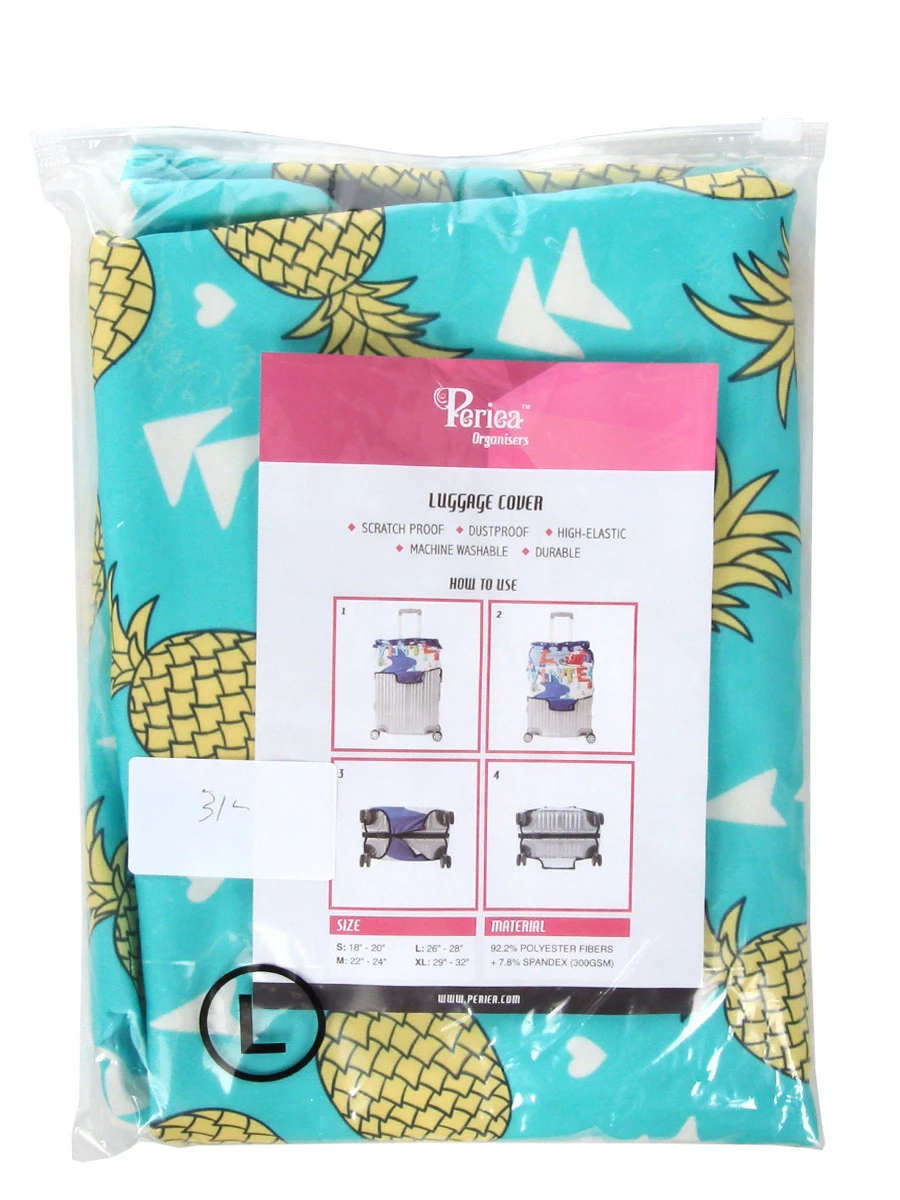 La housse de valise Periea Green with Yellow Pineapples L redonne des couleurs Ă votre valise avec ses motifs d’ananas jaunes sur fond vert menthe. Que ce soit pour rajeunir une valise ancienne ou personnaliser et protĂ©ger des Ă©raflures et de la saletĂ© votre nouvelle valise toute neuve, cette housse est un accessoire indispensable. Conçue pour recouvrir de grandes valises, elle s’adapte Ă plusieurs tailles jusqu’Ă 78 cm de hauteur grâce Ă sa confection en polyester et spandex qui lui confère de l’Ă©lasticitĂ©.