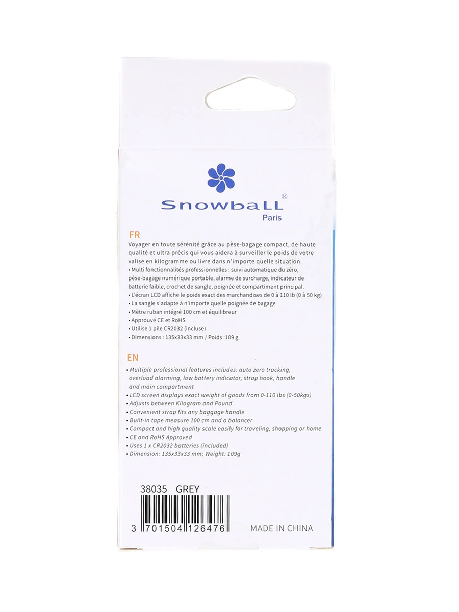 Simple d’utilisation, le pèse valise électronique LCD Snowball est équipé d’une sangle avec fermoir métallique que l’on passe dans la poignée de la valise ou du sac dont on souhaite vérifier le poids. L’appareil est doté d’une alarme de surpoids qui avertit lorsque le bagage dépasse 20 kg : des barres correspondant à 2 kg s’affichent progressivement, jusqu’à 10 barres, correspondant donc à 20 kg et déclenchant un signal. Un petit niveau à bulle intégré permet d’ajuster la position du bagage pour une précision optimale de la pesée. Pour compléter la vérification du poids par celle des dimensions du bagage, un petit mètre est également intégré dans le corps de l’appareil. Celui-ci fonctionne avec une pile bouton CR2032 fournie.