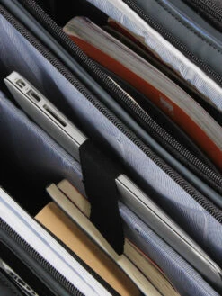 Le pilot case 2 roues Delsey Parvis Plus ImpermĂ©able possède un compartiment arrière muni d’un trieur souples parfaits pour sĂ©rier quelques documents de travail. LĂ , si nĂ©cessaire, un peu de linge et une trousse de toilette trouvent une place de choix. Son compartiment avant renferme quant Ă lui une poche matelassĂ©e pouvant accueillir un ordinateur jusqu’Ă 17.3 pouces et une poche zippĂ©e idĂ©ale pour les câbles et cordons d’alimentation. Pochettes, revues techniques et mĂ©mos peuvent Ă©galement y ĂŞtre rangĂ©s dans ce compartiment. Sa grande poche frontale fourmille d’options de rangement astucieuses comme sa poche pour tablette, sa poche pour tĂ©lĂ©phone, ses poches cartes de visite ou ses passants pour stylos. Au dessus, une dernière petite poche Ă zip permet de laisser accessibles un trousseau de clĂ©s ou un pass pour les transports.