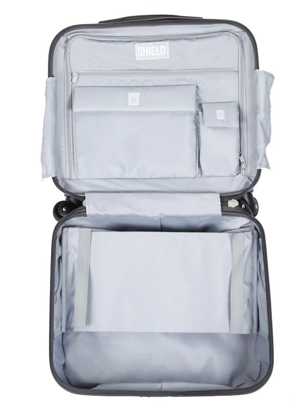 CĂ´tĂ© intĂ©rieur, ce pilot case Elite Shield Apollo ne manque pas de rangements. Il est Ă©quipĂ© de deux compartiments, le premier se ferme Ă l’aide d’une fermeture Ă glissière. Son rabat est muni d’une large poche zippĂ©e, d’une poche pour tablette, d’une poche pour tĂ©lĂ©phone portable et d’une poche pour placer le cordon d’alimentation. Le second compartiment offre une capacitĂ© de rangement supplĂ©mentaire et dispose notamment d’une housse rembourrĂ©e et amovible, pouvant accueillir un ordinateur 16 pouces en toute sĂ©rĂ©nitĂ©, et de petites poches spĂ©cifiques pour des stylos. Une petite trousse vient complĂ©ter le tout pour ranger Ă part des accessoires ou des produits de soin.Â