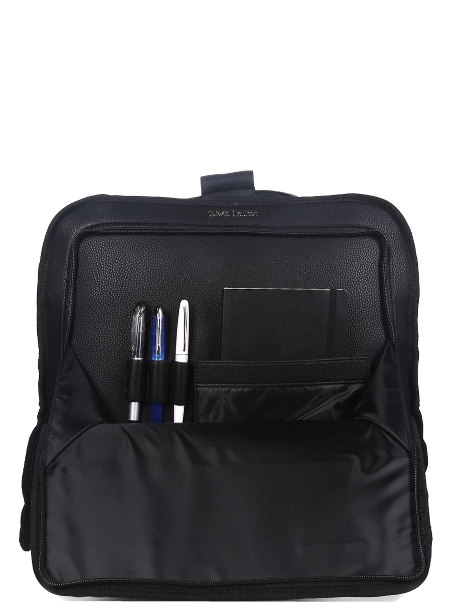A l’extĂ©rieur, il est muni d’une grande poche organiseur, contenant des passants pour stylos et une grande poche plate.