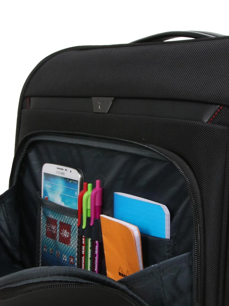 Le pilot case 4 roues Roncato Biz 4.0 dispose d’un compartiment doublĂ© dotĂ© de 2 sangles papillon Ă©lastiques. LĂ , quelques tenues de rechange trouvent une place de choix. Pour maximiser son espace de rangement ou simplement avoir son ordinateur 15.6 pouces Ă portĂ©e de main, sa poche matelassĂ©e est dĂ©tachable. Pour une tablette, une autre poche rembourrĂ©e est prĂ©sente. Ses 2 grandes poches en maille filet permettent de sĂ©rier Ă part des paires de chaussettes ou des accessoires multimĂ©dia (souris, cordon d’alimentation) en fonction des besoins et des utilisations. Quelques documents de travail peuvent ĂŞtre placĂ©s devant sa poche ordinateur si nĂ©cessaire. A l’extĂ©rieur, une grande poche frontale vient complĂ©ter le tout pour toujours plus de fonctionnalitĂ©.
