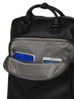 Côté rangement, le sac Gérard Hénon Amsterdam dispose d’un compartiment doublé équipé d’une grande poche matelassée pour ordinateur 15.6 pouces, d’une poche zippée pour câbles d’alimentation et de 2 poches ouvertes pour divers petits effets personnels, notamment. Des documents A4, des livres ou encore un peu de linge peuvent également être rangés à l’intérieur. Ses 2 poches frontales permettent de sérier à part le portefeuille, le téléphone, le trousseau de clés ou toutes autres indispensables au bon déroulement de la journée. Au niveau de son dossier, on trouve une dernière poche zippée très discrète permettant d’emporter en sécurité certains papiers importants (passeport, etc.).