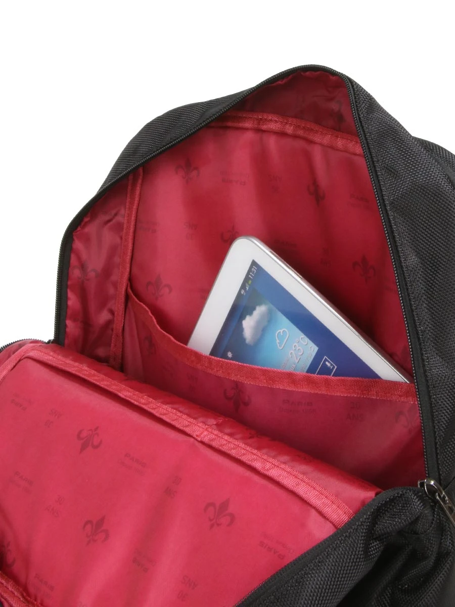 Le sac Ă dos Lys Cincinnati Slim dispose Ă l’arrière d’un compartiment matelassĂ© pour un ordinateur jusqu’Ă 15.6 pouces. Le second compartiment accueille nombre de dossiers au format A4 et les maintient bien en place grâce Ă sa poche plate. En face, deux petites poches permettent d’y glisser batterie nomade et clefs USB (non fournies) par exemple. Deux poches frontales dont l’une zippĂ©e permettent de ranger livres, clefs, ou carte de transport en accès rapide. A l’arrière, une grande poche plate fermĂ©e par un bouton pression est parfaite pour le portefeuilles et autres documents importants.