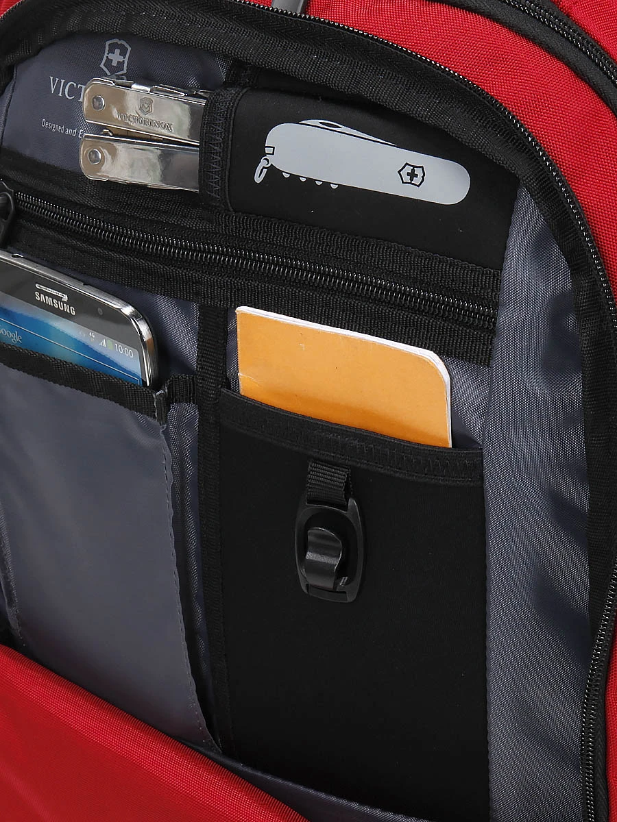 Le sac casual Victorinox VX Sport Evo Daypack offre 2 compartiments spacieux parfaits pour un peu de linge, des documents de travail, des affaires de cours… Pour un ordinateur 16 pouces et une tablette, son compartiment arrière renferme 2 poches spĂ©cifiques. Pour sĂ©rier efficacement petits effets personnels et accessoires multimĂ©dia, sa grande poche frontale dispose de nombreuses petites poches. On y trouve Ă©galement une poche pour couteau suisse et une attache porte clĂ©s. Sur les cĂ´tĂ©s, 2 poches porte bouteille viennent complĂ©ter le tout.