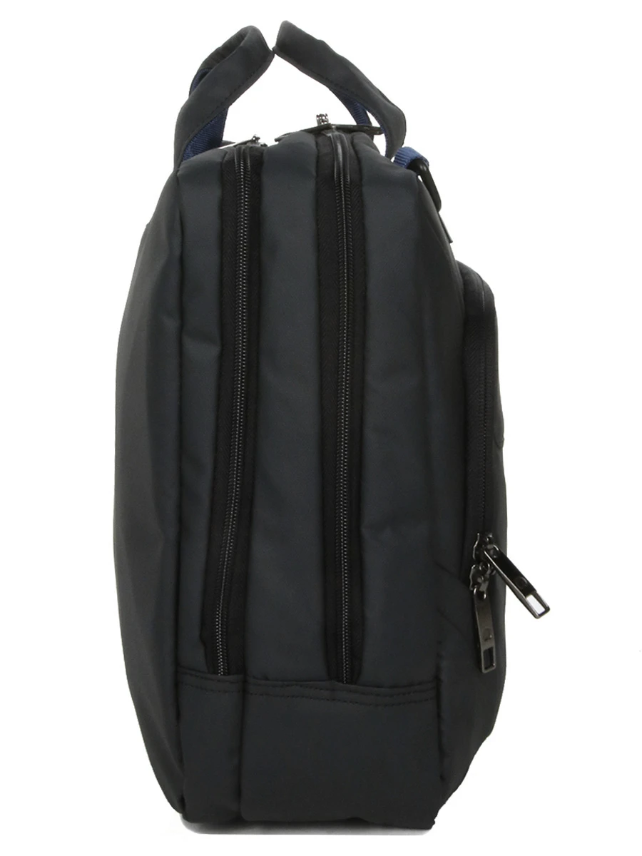 La sacoche business Delsey Parvis Plus ImpermĂ©able possède trois compartiments doublĂ©s dont deux qui partagent la mĂŞme ouverture. Ceux-ci sont sĂ©parĂ©s par une cloison qui permet de trier des dossiers au format A4 soigneusement. Le troisième peut Ă©galement accueillir des dossiers supplĂ©mentaires et dispose d’une poche rembourrĂ©e avec sangle de maintien Ă©lastique pensĂ©e pour un ordinateur jusqu’Ă 15.6 pouces. En dessous, deux poches en maille filet permettent de ranger les câbles et accessoires. La grande poche frontale est munie de plusieurs poches intĂ©rieures : une matelassĂ©e pour tablette, deux pour cartes de visite, deux conçues respectivement pour la batterie nomade (non incluse) et le tĂ©lĂ©phone avec sa coque, ainsi que deux passants pour stylos.Au dessus, une petite poche avec zip inversĂ©e permet de garder des petits objets Ă l’abri de l’humiditĂ©.