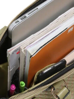 Le compartiment de la sacoche Olivia Lauren Sofia peut accueillir une multitude de dossiers au format A4. La poche matelassĂ©e est conçue pour un ordinateur jusqu’Ă 15 pouces. Celui-ci est maintenu en place quelles que soient les pĂ©rĂ©grinations de sa propriĂ©taire grâce Ă la bande Ă scratch. En face, la poche zippĂ©e est parfaite pour le chargeur, tandis que les trois poches plates peuvent loger carnet, batterie nomade (non incluse), et tĂ©lĂ©phone portable avec sa coque. Pour en finir avec les recherches interminables de stylos tombĂ©s au fond du sac, trois passants permettent de les garder Ă portĂ©e de main.