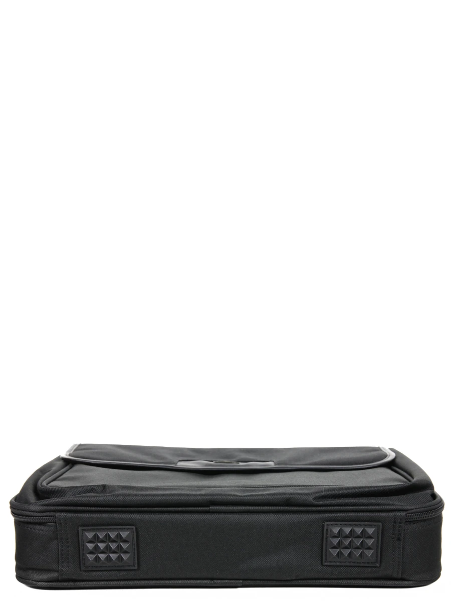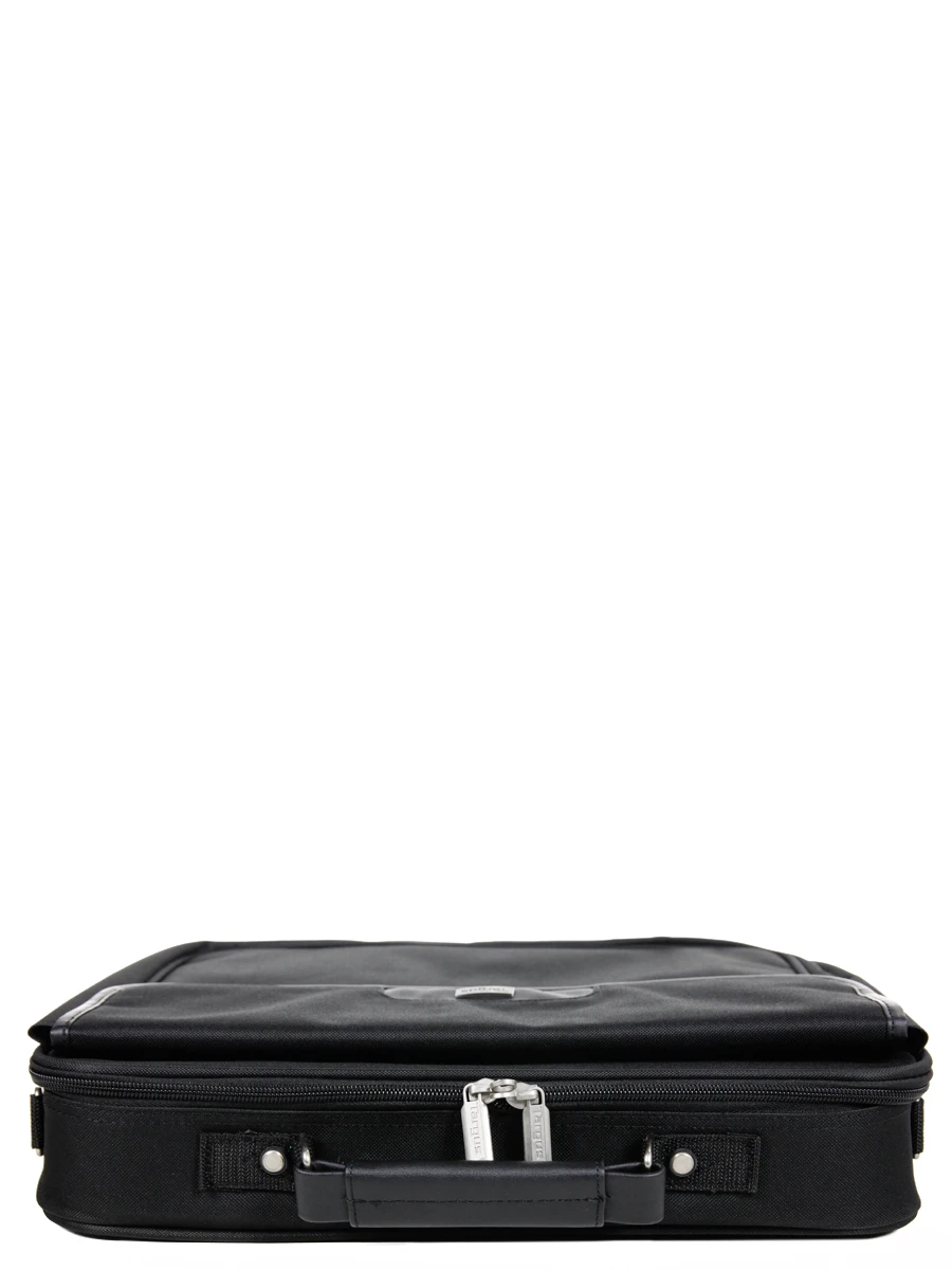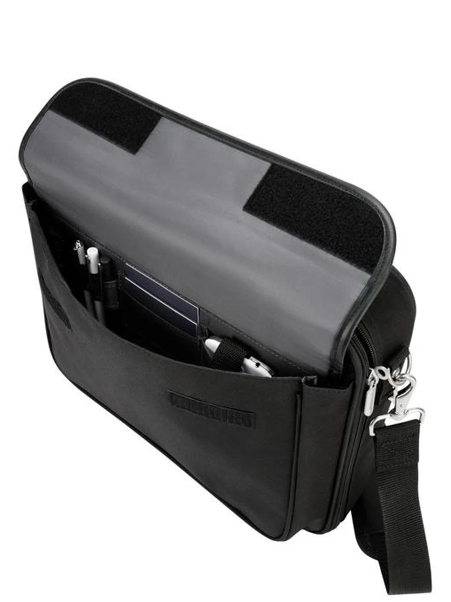 La partie extĂ©rieure de ce sac ordinateur Targus Classic se compose d’une poche frontale Ă rabat, cachant de multiples petits espaces de rangement pour stylos, cartes de visite, bloc-note et autre documents et d’une poche arrière Ă scratch.
