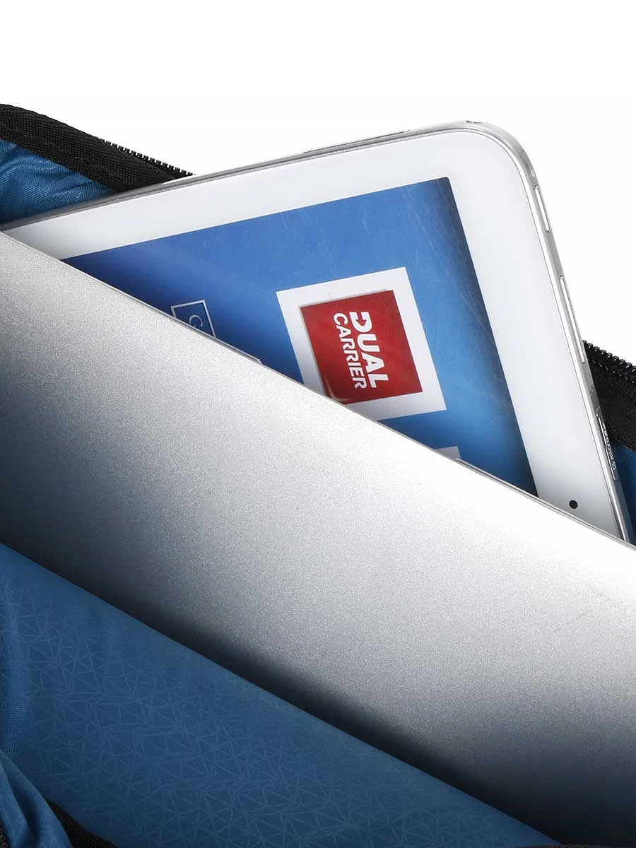 On trouve aussi sur ce sac, une sangle dorsale servant Ă le faire tenir stablement au dessus d’un sac Ă roulettes, d’un pilot case ou d’une valise.