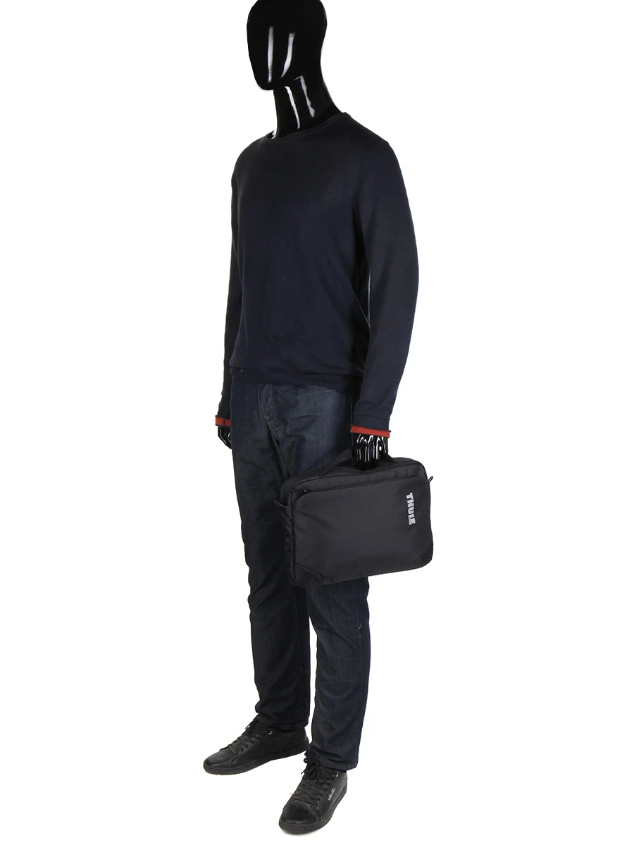 Cette sacoche business Thule Subterra peut contenir un MacBook Pro, Air ou Retina 13 pouces dans son compartiment rembourrĂ© et doublĂ©, prĂ©vu Ă cet effet. Elle renferme Ă©galement une poche renforcĂ©e pour tablette. A l’extĂ©rieur, on trouve une poche arrière Ă scratch et une poche frontale d’organisation, avec divers espaces spĂ©cifiques pour le tĂ©lĂ©phone, le chargeur, les Ă©couteurs, les stylos ainsi qu’une poche doublĂ©e en polaire pour une paire de lunettes.