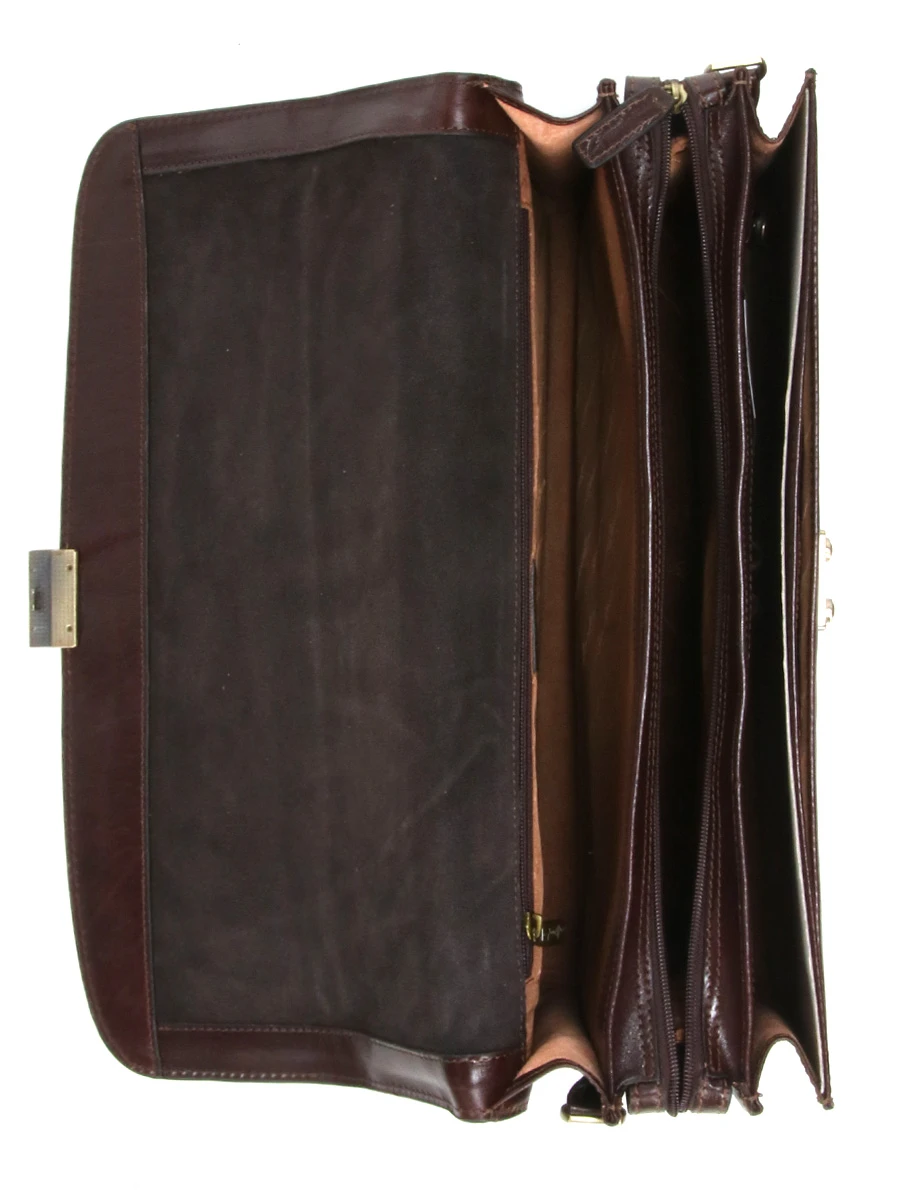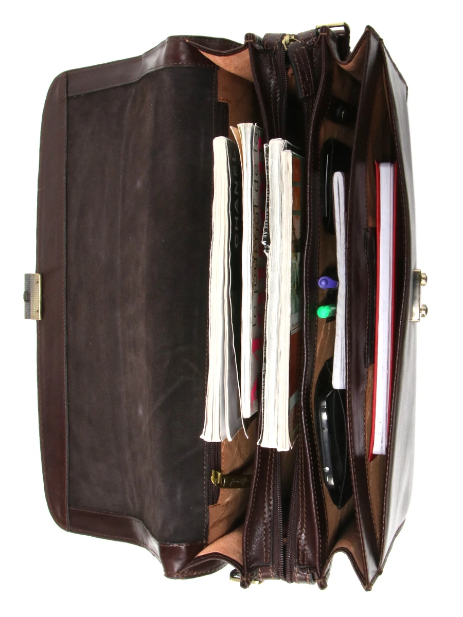 Les 3 soufflets de la serviette cuir Gérard Hénon Executive propose des compartiments généreux. Le premier renferme une poche à glissière pour déposer documents importants à garder sur le long terme, par exemple. Le compartiment central entièrement matelassé permet de mettre en toute sûreté un ordinateur de 14 pouces. D’une largeur de 37 cm, il peut également accueillir une tablette. Le compartiment avant, permet d’organiser ses essentiels en un clin d’œil (2 petites poches et 2 emplacements pour stylo). Un porte clé intégré permet quant à lui de retrouver son trousseau de clés aisément. Située à l’avant, une poche permet de ranger deux cartes de visite dans un emplacement prévu à cet effet. Des papiers de voiture et un badge peuvent également rentrer au même endroit. Pour un accueil plus doux des affaires, la serviette est doublée à l’intérieur. Enfin, à l’extérieur, une poche arrière est un espace supplémentaire dédié au rangement mais pas seulement.