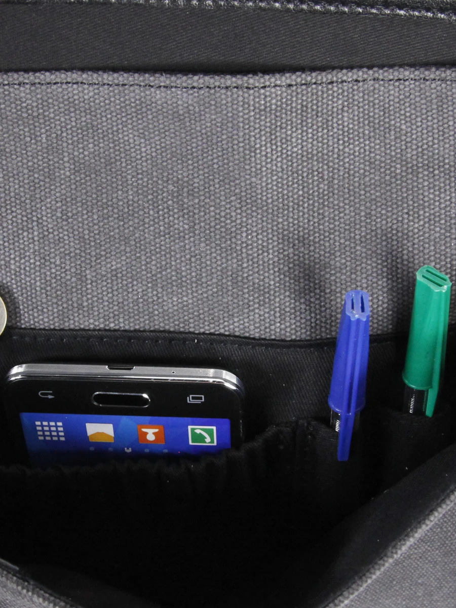 Le cartable Wylson Brenner se ferme Ă l’aide d’un rabat, muni d’une attache et d’une serrure Ă clĂ©. A l’intĂ©rieur, il est Ă©quipĂ© de 3 soufflets de rangement entièrement doublĂ©s. Le premier espace est dotĂ© d’une poche zippĂ©e, le second est vide et peut contenir divers documents / dossiers de travail. Le troisième et dernière soufflet est de type « organizer », c’est-Ă -dire qu’il est muni d’une poche pour tĂ©lĂ©phone portable, de porte stylos et de divers emplacements pour cartes de visite.