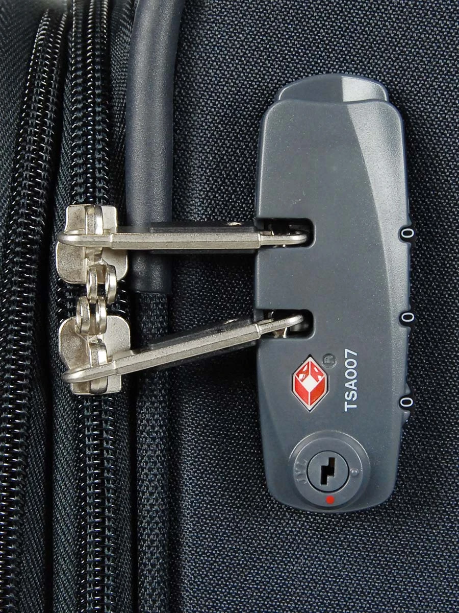 CĂ´tĂ© sĂ©curitĂ©, elle est Ă©quipĂ©e d’un porte Ă©tiquette imbriquĂ© sur le cĂ´tĂ©, qui permettra de facilement identifier son propriĂ©taire, ainsi que d’une serrure Ă combinaison TSA, grâce Ă laquelle on peut la verrouiller mais aussi passer les douanes amĂ©ricaines sans craindre une ouverture forcĂ©e.